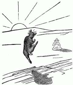THIS is the picture of Old Man Kangaroo at five in the afternoon, when he had got his beautiful hind legs just as Big God Nqong had promised. You can see that it is five o'clock, because Big God Nqong's pet tame clock says so. That is Nqong, in his bath, sticking his feet out. Old Man Kangaroo is being rude to Yellow-Dog Dingo. Yellow-Dog Dingo has been trying to catch Kangaroo all across Australia. You can see the marks of Kangaroo's big new feet running ever so far back over the bare hills. Yellow-Dog Dingo is drawn black, because I am not allowed to paint these pictures with real colours out of the paint-box; and besides, Yellow-Dog Dingo got dreadfully black and dusty after running through the Flinders and the Cinders.