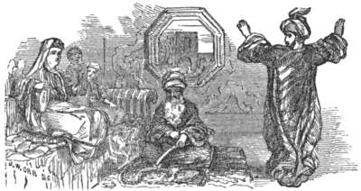 "Perceivest thou now why I am enchanted, Grand-Vizier? This Mizra is the son of my deadly enemy, the mighty sorcerer Kaschnur, who, in an evil hour, vowed revenge against me. Still I do not abandon all hope. Come with me, thou faithful companion of my misery; we will go to the grave of the Prophet; perhaps in that holy spot the charm may be dissolved." They raised themselves from the roof of the palace, and flew in the direction of Medina.