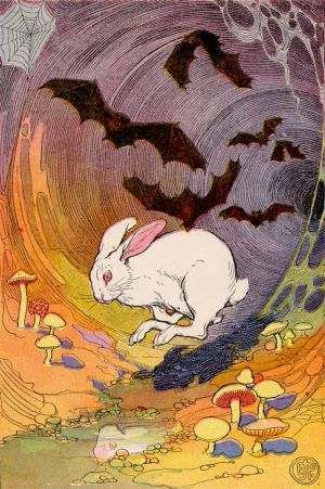 Bumper wagged the stump of tail that he thought would convince the bats, but for a moment, he wasn't exactly sure that he saw it himself. Instead of a white, fluffy stub of a tail as soft as cotton, he saw the dirtiest, blackest wad of hair waving in the air that had ever disgraced a rabbit. The truth flashed upon his mind in an instant. What he had supposed to be the blindness of the bats was nothing more than a most natural circumstance.