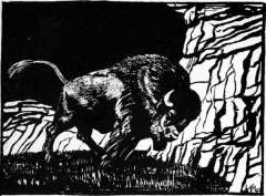 Soon, however, the pursuing head emerged from the thick trees. The children got up and ran as hard as they could, but close behind them came the severed head, rolling its eyes and gnashing its teeth in a great frenzy, and uttering terrible yells. It was very near to them, when the children again remembered their father's gifts. They threw the white stones behind them, and at once a high mountain of white rock rose between them and their enemy. They sat on the ground and rested, and said, "Oh dear, oh dear, what shall we do? We have only one means of safety left, these little bits of moss." The wicked head hurled itself against the mountain, but it could not get through. A big buffalo bull was feeding on the grass near it, and the head called to him to break a road through the mountain. The bull rushed at the mountain with all his force, but the mountain was so hard that it broke his head and he fell down dead. Some moles were playing in the soft earth near by, and the head called to them to make a passage through the hill. So the moles searched and found a soft earthy place in the midst of the rock and soon they tunnelled a hole to the other side of the mountain, through which the head was able to pass. When the children saw their pursuer coming out of the moles' tunnel they cried loudly and ran away as fast as they could. At last, after a very long chase, the head was almost upon them, and they decided to use their last means of protection. They threw the wet moss behind them, and at once a long black swamp appeared where the moss had fallen, between them and their wicked follower. The head was going at such a great speed, bumping over the ground, that it could not stop. It rolled into the swamp and disappeared into the soft mud and was never seen again.