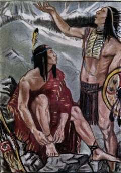 Great Heart was much puzzled when Scarlet Runner did not appear, and as he saw the maiden's runner coming nearer, he said, "What can have happened? I fear I am beaten." But Keen Ears threw himself flat on the ground and listened. "Scarlet Runner is asleep," he called; "I hear him snoring on the plains far away." And with his keen sense of sound he located the exact spot where the runner was lying. "I will soon wake him," said Far-Darter, as he fitted an arrow to his bow-string. The people all thought him mad, for they had never seen an arrow shot so great a distance beyond their sight. But Far-Darter was not dismayed. He quickly shot an arrow from his bow to the spot which Keen Ears had indicated. His aim was so true that the arrow hit Scarlet Runner on the nose and aroused him from his sleep. But when he rose to his feet he found that his rival was gone and he knew that he had been deceived. So in a great rage because of the trick and the pain in his nose, he set out for the village running like the wind. His rival had almost reached the end of the race, but by putting all his strength into his effort, Scarlet Runner quickly over-took him and passed him near the winning-post and won the race. And the people wondered greatly at these great deeds of the strangers.