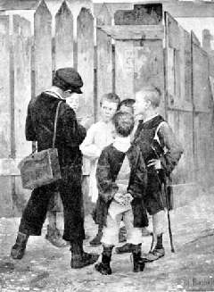 The American street boy is a distinct type: his ambition is to rise in the world. Wealth, fame, and power may be his, if he will but labor to attain them, and to this end he throws himself ardently into the building of a career. For a certain portion of the day he is a man of affairs. Dashing through the net-work of wheels, in the thickest traffic of crowded thoroughfares, jumping on and off moving cars and carriages, pushing his way with untiring zeal, he shows a reckless daring and a dauntless energy which are unmatched among any other people. His duties done, he is a gentleman of leisure. He may amuse himself now as he pleases, and his recreations show the same versatility displayed in his business enterprises. Possessed of a lively imagination and a keen sense of humor, he is never at a loss for a source of fun. He is as generous as he is mischievous, always willing to share his good things with his companions. Altogether, he is an interesting and attractive figure, and it is no wonder that he has long since made his appearance on the canvas.