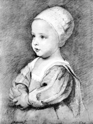 Another celebrated painting of the same child is in the Louvre at Paris, where it is a centre of attraction for art lovers and copyists, on account of the exquisite delicacy of its technique. It is a half-length portrait, showing a winning face, with wide, earnest eyes, and a demure little mouth. The fair hair is parted at one side, where it is caught back with a ribbon bow,--a style which the princess is said to have retained even after her marriage with the Emperor Leopold.