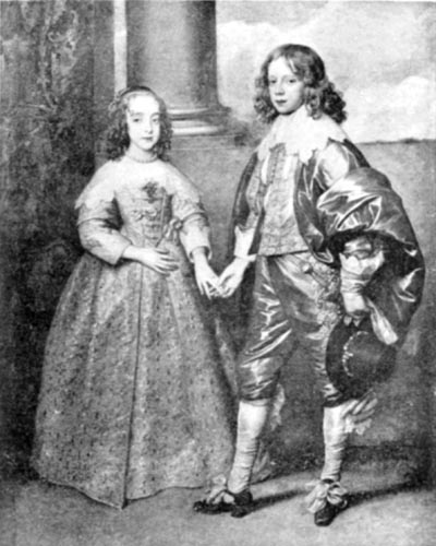 Next in popularity to the Turin picture is a group of five children, the original of which is at Windsor, and a replica at Berlin. The painting is dated 1637, fixing the age of Prince Charles as seven. Having now outgrown the frocks of the earlier pictures, he stands in a graceful boyish attitude, wearing satin knickerbockers and waistcoat, and still retaining the beautiful lace collar on his aristocratic shoulders. His eyes have the same dreamy look as in other portraits. On his right are his sisters Mary and Elizabeth, the former demurely complacent as before, the latter timid and dainty. On the left the little Princess Anne frolics with Prince James in simple childish fashion. As a composition, the picture is somewhat stiff and artificial, but the single figures are all rendered with characteristic beauty.