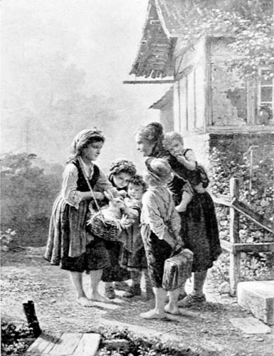The out-of-door scenes have the picturesque mountain scenery of the Alps for their background, and sometimes a pretty cottage is included in the scene. A characteristic example is the Little Rabbit-Seller. A group of children gather round a little girl, who carries, suspended from her shoulders, a large basket of rabbits. Two of the number peep with intense interest into the basket, delighted with the opportunity to feed the pretty creatures. The others are talking with the young merchant,--a school-boy with book satchel held behind him, and an older girl holding a curly-haired child on her back. The pure, gentle face of the young girl is one not to be easily forgotten, and which reappears on other canvases of the artist. The affectionate care of this older sister for the child she carries is one of many instances in which the same trait is shown in Meyer's pictures, and is eminently characteristic of the Germans.