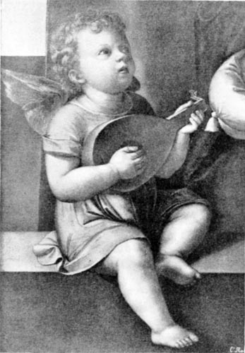 This is very marked in Raphael's work, as may be seen in his Madonna del Baldacchino, a painting whose style of composition is strikingly like that of Bartolommeo. Of the two singing angels at the foot of the Madonna's throne, one studies eagerly the meaning of his music, while the other sings with the happy unconsciousness of a bird. Comparing with this Raphael's grandest achievement, the Sistine Madonna, we find the same