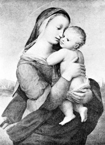 The Christ-child of the Tempi painting is a dimpled baby shyly nestling against his mother's breast; the Sistine Child is a royal messenger lightly enthroned upon the Madonna's arm. In one conception, Mother and Son are absorbed entirely in each other; in the other, they think only of their mission to humanity, their wide eyes searching the future with far-seeing gaze, and their thoughts intent upon the coming of the heavenly kingdom.