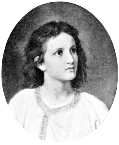 Professor Deger's picture expresses a unique and lovely conception of the Christ-child in the fields, communing with his Father, and preparing for his ministry. He is a dreamy-looking boy, of delicate features, and broad, high brow, with fair curls blowing away from his face. Though alone, he lifts his hand in blessing, as if, in his prophetic imagination, the meadows were already peopled with the throngs to whom he is to teach the sweet lessons of the lilies and the sparrow.