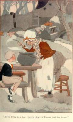 The Old Woman's manner became more sullen than ever. She seized upon a ladle and began stirring the steaming pot. "It does very well," she declared. "Houses are funny or otherwise according to what goes on in them. When you've got your hands full of children who don't want to work you can't say that your house is exactly funny. Its being an old shoe--if that's what you mean . . . that's a matter of taste. I prefer it, for my part. I'd never have been able to settle down anywhere else. You see, I had to be on my feet mostly all the time from little on, and now it comes natural, being in a shoe. I can imagine I'm on the go, even if I never get out from one week's end to another."