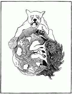 and the Armadillo all in a heap. It looks rather the same any way you turn it. The Tortoise is in the middle, learning how to bend, and that is why the shelly plates on his back are so spread apart. He is standing on the Hedgehog, who is waiting to learn how to swim. The Hedgehog is a Japanesy Hedgehog, because I couldn't find our own Hedgehogs in the garden when I wanted to draw them. (It was daytime, and they had gone to bed under the dahlias.) Speckly Jaguar is looking over the edge, with his paddy-paw carefully tied up by his mother, because he pricked himself scooping the Hedgehog. He is much surprised to see what the Tortoise is doing, and his paw is hurting him. The snouty thing with the little eye that Speckly Jaguar is trying to climb over is the Armadillo that the Tortoise and the Hedgehog are going to turn into when they have finished bending and swimming. It is all a magic picture, and that is one of the reasons why I haven't drawn the Jaguar's whiskers. The other reason was that he was so young that his whiskers had not grown. The Jaguar's pet name with his Mummy was Doffles.