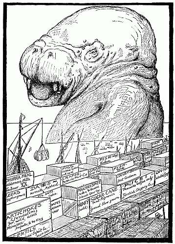 THIS is the picture of the Animal that came out of the sea and ate up all the food that Suleiman-bin-Daoud had made ready for all the animals in all the world. He was really quite a nice Animal, and his Mummy was very fond of him and of his twenty-nine thousand nine hundred and ninety-nine other brothers that lived at the bottom of the sea. You know that he was the smallest of them all, and so his name was Small Porgies. He ate up all those boxes and packets and bales and things that had been got ready for all the animals, without ever once taking off the lids or untying the strings, and it did not hurt him at all. The sticky-up masts behind the boxes of food belong to Suleiman-bin-Daoud's ships. They were busy bringing more food when Small Porgies came ashore. He did not eat the ships. They stopped unloading the foods and instantly sailed away to sea till Small Porgies had quite finished eating. You can see some of the ships beginning to sail away by Small Porgies' shoulder. I have not drawn Suleiman-bin-Daoud, but he is just outside the picture, very much astonished. The bundle hanging from the mast of the ship in the corner is really a package of wet dates for parrots to eat. I don't know the names of the ships. That is all there is in that picture.