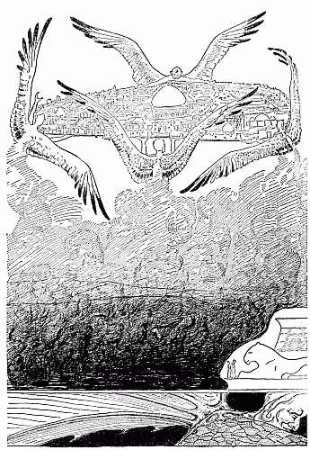 THIS is the picture of the four gull-winged Djinns lifting up Suleiman-bin-Daoud's Palace the very minute after the Butterfly had stamped. The Palace and the gardens and everything came up in one piece like a board, and they left a big hole in the ground all full of dust and smoke. If you look in the corner, close to the thing that looks like a lion, you will see Suleiman-bin-Daoud with his magic stick and the two Butterflies behind him. The thing that looks like a lion is really a lion carved in stone, and the thing that looks like a milk-can is really a piece of a temple or a house or something. Suleiman-bin-Daoud stood there so as to be out of the way of the dust and the smoke when the Djinns lifted up the Palace. I don't know the Djinns' names. They were servants of Suleiman-bin-Daoud's magic ring, and they changed about every day. They were just common gull-winged Djinns.