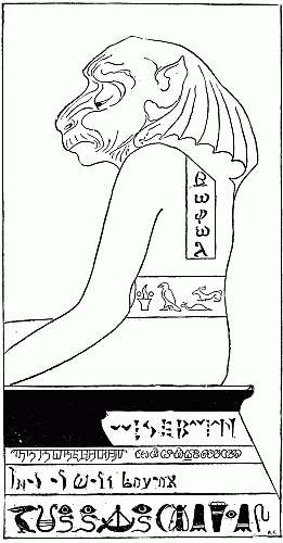 THIS is Wise Baviaan, the dog-headed Baboon, Who is Quite the Wisest Animal in All South Africa. I have drawn him from a statue that I made up out of my own head, and I have written his name on his belt and on his shoulder and on the thing he is sitting on. I have written it in what is not called Coptic and Hieroglyphic and Cuneiformic and Bengalic and Burmic and Hebric, all because he is so wise. He is not beautiful, but he is very wise; and I should like to paint him with paint-box colours, but I am not allowed. The umbrella-ish thing about his head is his Conventional Mane.