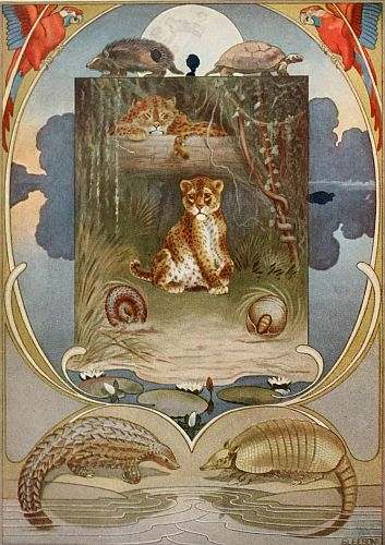 But also, and at the same time, in those High and Far-Off Times, there was a Painted Jaguar, and he lived on the banks of the turbid Amazon too; and he ate everything that he could catch. When he could not catch deer or monkeys he would eat frogs and beetles; and when he could not catch frogs and beetles he went to his Mother Jaguar, and she told him how to eat hedgehogs and tortoises.