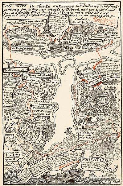 THIS is an inciting map of the Turbid Amazon done in Red and Black. It hasn't anything to do with the story except that there are two Armadillos in it--up by the top. The inciting part are the adventures that happened to the men who went along the road marked in red. I meant to draw Armadillos when I began the map, and I meant to draw manatees and spider-tailed monkeys and big snakes and lots of Jaguars, but it was more inciting to do the map and the venturesome adventures in red. You begin at the bottom left-hand corner and follow the little arrows all about, and then you come quite round again to where the adventuresome people went home in a ship called the