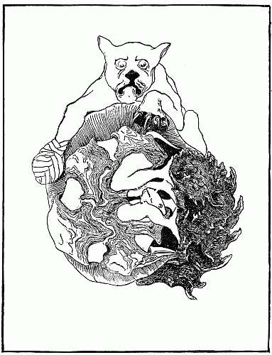 Then they both curled themselves up and rolled round and round Painted Jaguar till his eyes turned truly cart-wheels in his head.