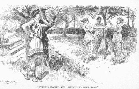 Then Perseus went forward and spoke to the Maidens. They stopped singing, and stood still as if in alarm. But when they saw the Magic Slippers on his feet, they ran to him, and welcomed him to the Western Land and to their garden.