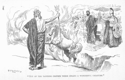 Neptune gave the first gift. He stood on the highest point of the hill where the rock was bare, and bade the people see his power. He raised his three-pointed spear high in the air, and then brought it down with great force. Lightning flashed, the earth shook, and the rock was split half way down to the bottom of the hill. Then out of the yawning crevice there sprang a wonderful creature, white as milk, with long slender legs, an arching neck, and a mane and tail of silk.