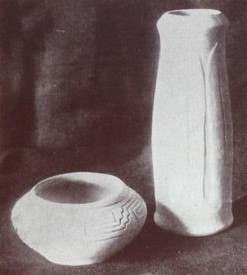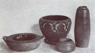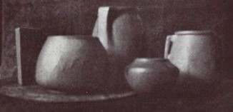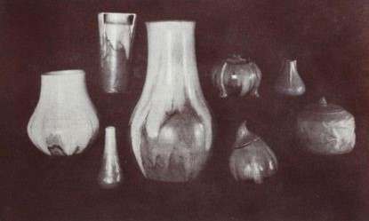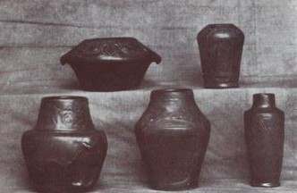 Examples of Pewabic pottery showing matt glazes in ivory and browns. This entire product has been developed from the earliest experiments to the present point of artistic and technical interest, entirely by the means of the Revelation Pottery Kilns.