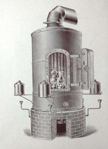 This kiln is of practical construction for an art pottery or other manufacturing. It develops and sustains a reliable, even heat, and the circular form keeps all parts under perfect control. The interior with tests or pyrometric cones are within easy view through peep hole. It has five burners, and a separate combustion chamber, so that each burner works independently. It has a door on a Crane Hinge, so that it does not have to be bricked up each time.
