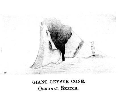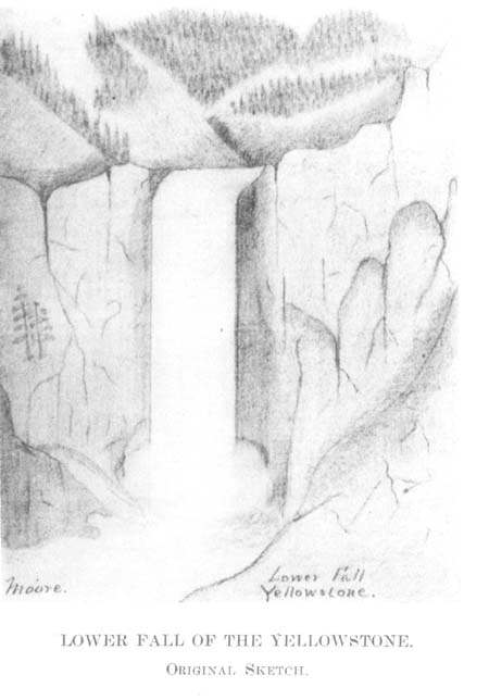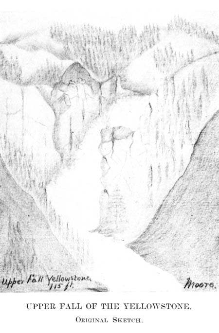 The accompanying sketches of the two falls of the Yellowstone, and of the cones of the Grand and Castle geysers, were made by Walter Trumbull and Private Moore. They are the very first ever made of these objects. Through an inadvertence in the preparation of the electroyped plates for the printer, they did not appear in their proper places in this diary. Major Hiram M. Chittenden, in his volume "The Yellowstone Park," says of the two sketches made by Private Moore: "His quaint sketches of the falls forcibly remind one of the original picture of Niagara, made by Father Hennepin, in 1697."