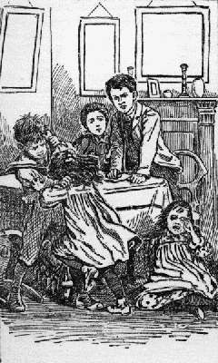 "Be quiet, Jennie! Pollie and Harry, if you don't leave off fighting at once, I'll box your ears all round!" cries Bob, looking up angrily from his work.