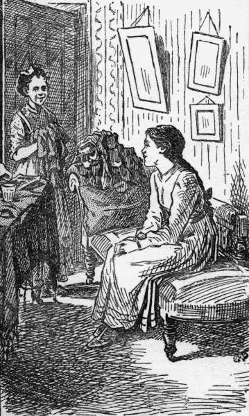 Clara, the little maid-of-all-work, is sleepily laying the kitchen fire. Her dirty apron has a great "jag" all across the front, and her tumbled cap is set all askew on her mass of dusty-looking hair.