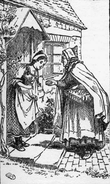 By the open door of a rose-clad cottage stands a little maiden. She wears the quaint close cap and quilted petticoat of the olden time, and is eagerly looking at something which the dear old dame in front of her holds tightly clasped beneath the fingers of her right hand.