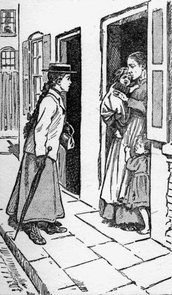 She consults her list, and knocks timidly at the door of the first number. No answer. She knocks again. A shuffling of feet follows, and presently a woman appears. She is haggard and old-looking, and the child in her arms is wailing pitifully. A second child clings to her skirt, and mother and children alike are wretchedly clad.