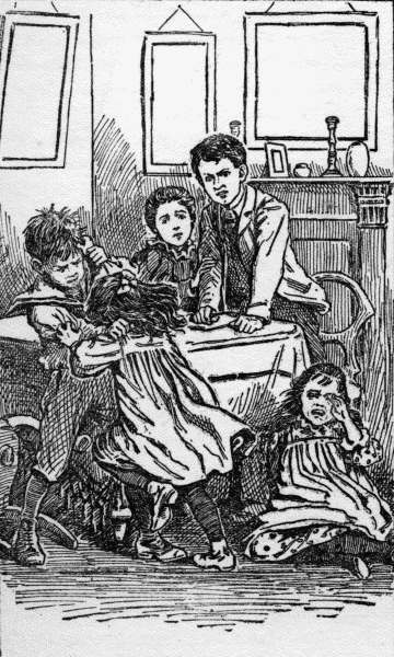 But Betty is powerless to stop the storm. Bob tries to separate Harry and Pollie, who are fighting desperately. Harry kicks at Bob, whereat the elder brother loses his temper altogether, and cuffs Harry vigorously on both sides of his head. Harry roars; Jennie and Pollie continue to shriek. Bob, his face flaming with wrath, drags each screaming, kicking child to the door, and flings it into the passage. Then he locks the door, and with flushed face and tumbled hair, though pretending to look quite unconcerned, goes on with the books, in spite of the yells from the passage outside.