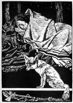 Then one day he emerged from the snow country and came to a land where the airs were warmer and where little streams were flowing. Suddenly he came upon the body of a dead man lying across his path. He stopped and buried the body, for he thought that it was not right to leave it lying bare upon the ground for the birds to peck at. That night as he went along in the moonlight he met a Fox in his path. "Hello," said the Fox. "What are you looking for so late at night in the forest?" And he answered, "I am looking for the bird of the sweet song, who will show me the way to the Healing Waters." And the Fox said, "I am the spirit of the man you buried yesterday by the forest path, and in return for your kindness to me I shall do a kindness to you. You have always been good to the animals and the birds, and you have never killed them needlessly, nor when you did not require them for clothing or for food. And you have always been careful of the flowers and the trees, and you have often protected them from harm. So now they want to be good to you, and I am going to guide you. But first you must rest, for you are tired from your long journey."