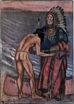 The boy was heart-broken because of his sister's death. And when the late spring came and the days grew warm and food was plentiful again, he said, "She must be somewhere in the West, for they say that our people do not really die. I will go and search for her, and perhaps I can find her and bring her back." So one morning he set out on his strange quest. He journeyed many days westward towards the Great Water, killing game for food as he went, and sleeping at night under the stars. He met many strange people, but he did not tell them the purpose of his travels. At last he came to the shore of the Great Water, and he sat looking towards the sunset wondering what next to do. In the evening an old man came along. "What are you doing here?" asked the man. "I am looking for my sister," said the boy; "some time ago she sickened and died and I am lonely without her, and I want to find her and bring her back." And the man said, "Some time ago she whom you seek passed this way. If you wish to find her you must undertake a dangerous journey." The boy answered that he would gladly risk any dangers to find his sister, and the old man said, "I will help you. Your sister has gone to the Land of Shadows far away in the Country of Silence which lies out yonder in the Island of the Blest. To reach the Island you must sail far into the West, but I warn you that it is a perilous journey, for the crossing is always rough and your boat will be tossed by tempests. But you will be well repaid for your trouble, for in that land nobody is ever hungry or tired; there is no death and no sorrow; there are no tears, and no one ever grows old."