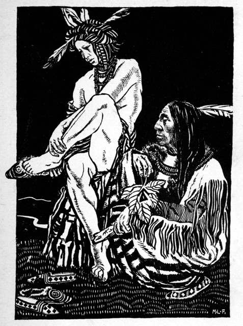 The stranger said, "Where are you going?" And the boy answered, "I am going far away. I am seeking adventure in the forest for it is very lonely down by the sea." But he did not tell him of his real errand. "You may stay with me to-night," said the new-comer. "I have a very comfortable lodge not far from here, and I will give you food." The boy was very hungry and tired, and he went along with the man to his lodge. When they reached the house the boy was surprised to see a great heap of bleached bones lying before the door. But he showed no fear nor did he comment on the horrible sight. Inside the lodge sat a very old and bent woman, tending a pot. She was stirring it with a big stick, and the boy saw that it contained meat stew. When she placed the stew before them, the boy said he would rather have corn, for he feared to taste the meat. The old woman fried some corn for him, and he had a good meal.