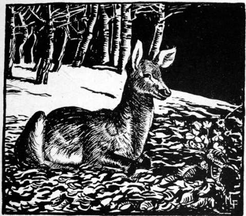 THE BOY WENT INTO THE FOREST WITH HIS BOW AND ARROWS. HE HAD NOT GONE FAR WHEN HE SAW A FAT YOUNG DEER, WHICH HE KILLED