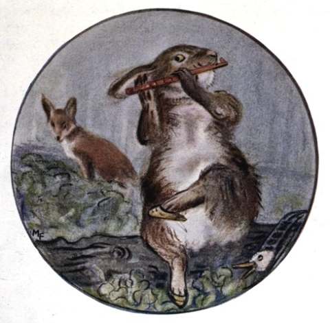 As Rabbit and Duck sat talking, they saw Fox trotting up the path. He was another customer coming for his corn. And Rabbit said courteously, "Madam, I see your old enemy Fox approaching. He will probably wish to eat you up; you had better hide." And Duck with her feathers all ruffled with excitement said, "Yes, yes, where shall I hide?" And Rabbit said, "Hide under this basket." So Duck crawled under the over-turned basket and sat very still.