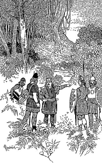 But Tyrker, still smiling and nodding his head, answered in German. He pointed to the woods and laughed and rolled his eyes. Again Leif asked his question and put his hand on Tyrker's shoulder as though he would shake him. Then Tyrker answered in the language of Iceland: