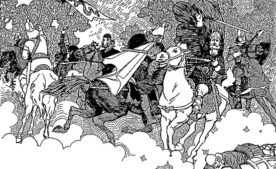 There was a blowing of horns on both sides. The two armies galloped down into the field and ran together. The fight had begun.