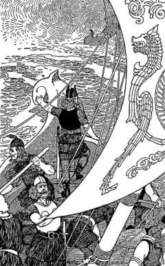 "This is a glorious sight," they said. "Surely no ship ever carried a richer load. Inside and out the boat blazes with gold and bronze, and, high over his riches, lies the great Ingolf, ready to take the tiller and guide to Valhalla, where all the heroes will rise up and shout him welcome."