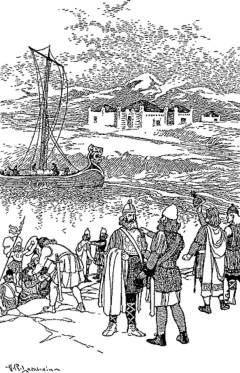 There was a little harbor there. The men rowed in and quickly jumped out and put the rollers under the ship and pulled her upon shore. Then they threw themselves down on the grass and rolled and stretched their arms and shouted for joy. After that they built a fire and warmed themselves and cooked a meal and ate like wolves. They slept there that night.
