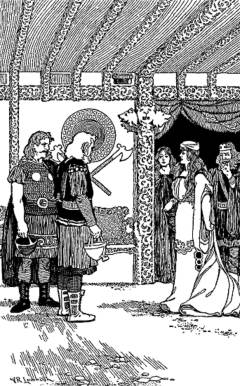 So they went in with very heavy hearts. There sat King Harald in the high seat. The benches on both sides were full of men. The tables had been taken out, and the mead-horns were going round.